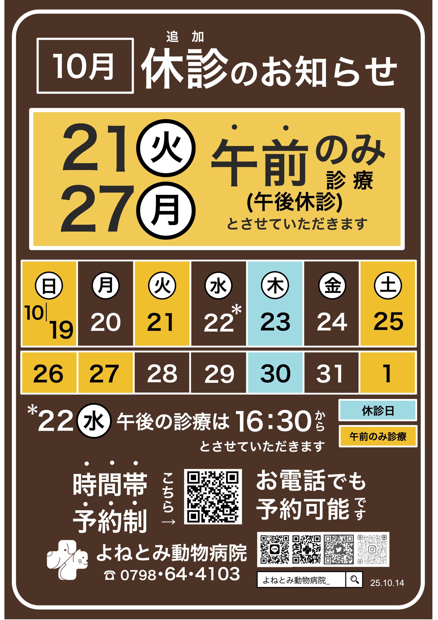 10月22日(水) 午後の診療は16:30から (午前は平常どおり診療)