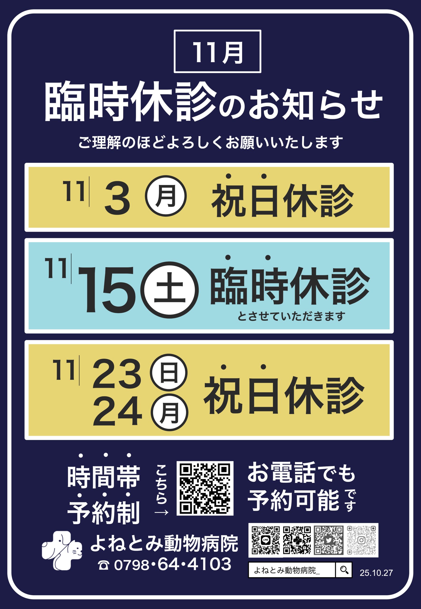 ホーム > 情報ブログ > 2025年 > 11月 > 6日2025年11月6日 臨時休診のお知らせ (11月) 2025年11月6日 木曜日 まことに勝手ながら、 11/15 (土) 臨時休診 11/23 (日・祝) ・24 (月・振休) 祝日休診とさせていただきます。 ご来院にあたり、ご不明な点がございましたら、事前にお問い合わせ下さい。 ご予約は下記予約サイト、またはお電話でも随時受付しています。http://16.mfmb.jp/90230828/ カテゴリー: 新着情報 | コメントは受け付けていません。